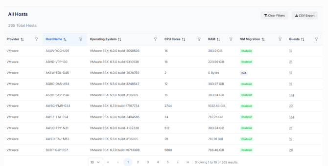 Provides a comprehensive list of every host in the customer environment. Columns include Host Name, Operating System, CPU Cores, RAM, VM Migration Status, and Guest Quantity.