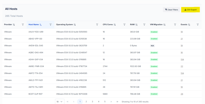 Users can click the number under the "Guests" column to drill down into the list of virtual machines running on that host. These lists are also exportable for further offline analysis.