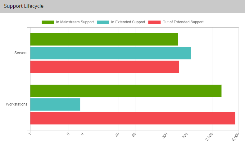 Displays a horizontal bar graph showing amounts of workstations and servers that are currently in mainstream support, in extended support, and out of extended support. The graph is color coded; green shows the amount in mainstream support, blue shows the amount in extended support, and red shows the amount out of extended support. Hover your cursor over each bar to see the exact numbers on that category of devices.