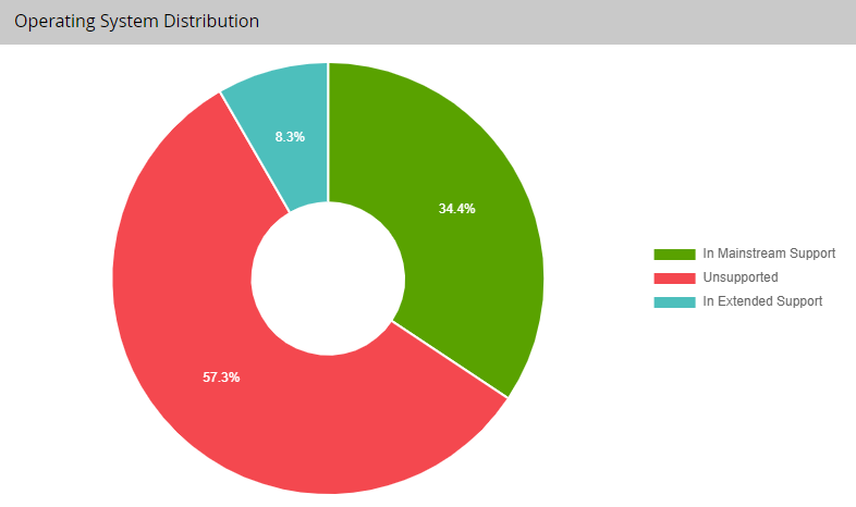 Displays a circle graph showing the percentage of workstation’s & server’s operating systems in mainstream support, in extended support, and unsupported. The graph is color coded, green shows in mainstream support, blue shows in extended support, and red shows unsupported. Hover your cursor over each section of the graph to see the number of operating systems fall into that category.